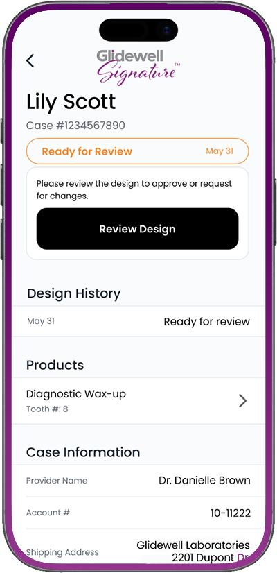 Glidewell’s My Account digital portal allows you to conveniently access your Signature 3D design proposal, approve the case plan, communicate with the lab, and more.